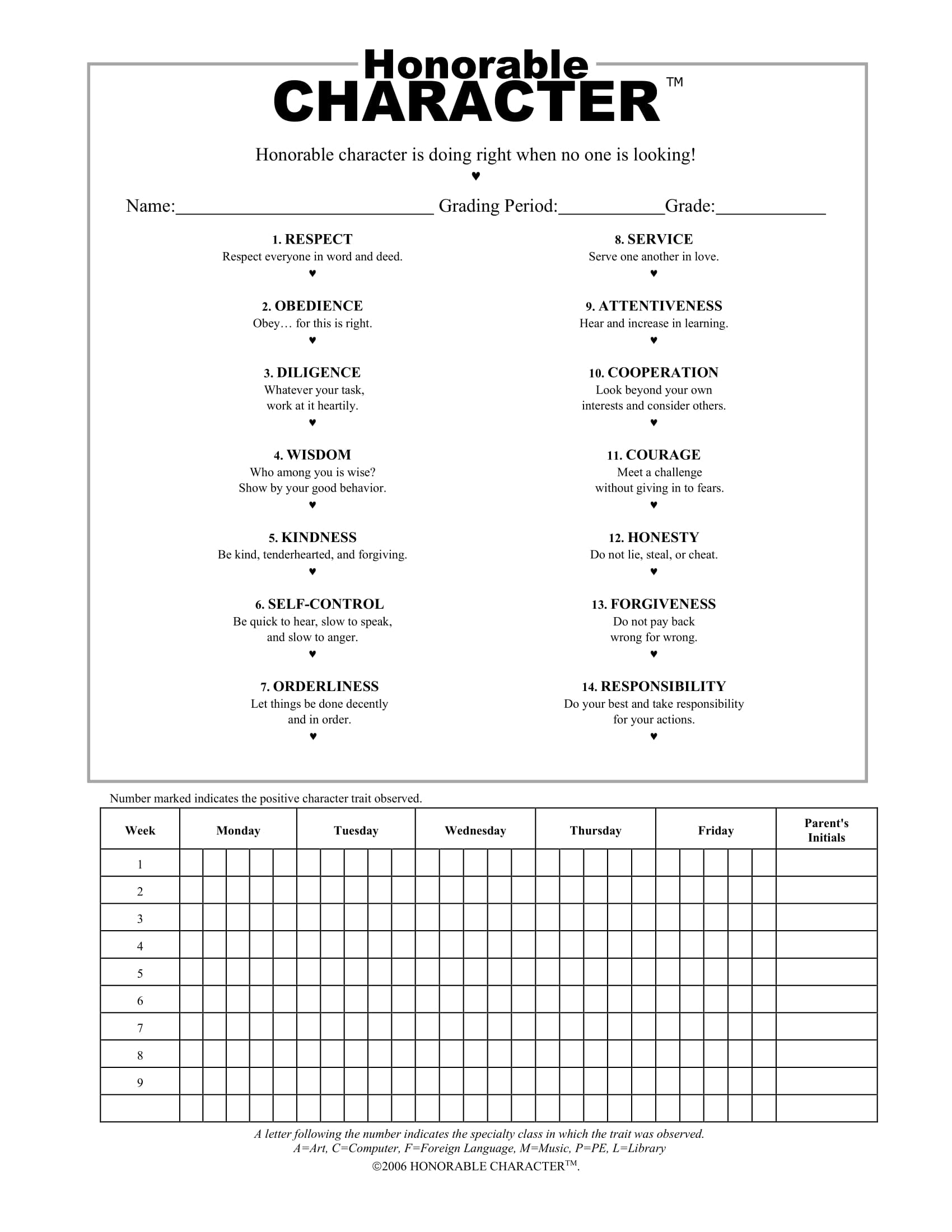 The Conduct Card provides a consistent, positive way for teachers to build authentic school-family partnerships. Teachers inform parents of their child's honorable choices and correction marks via this simple, weekly communication tool.